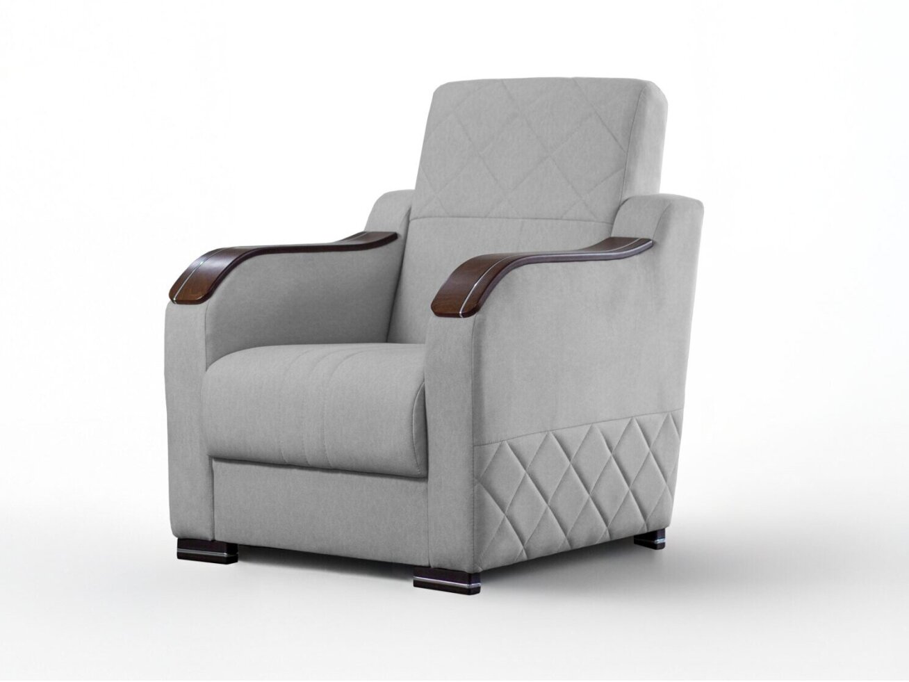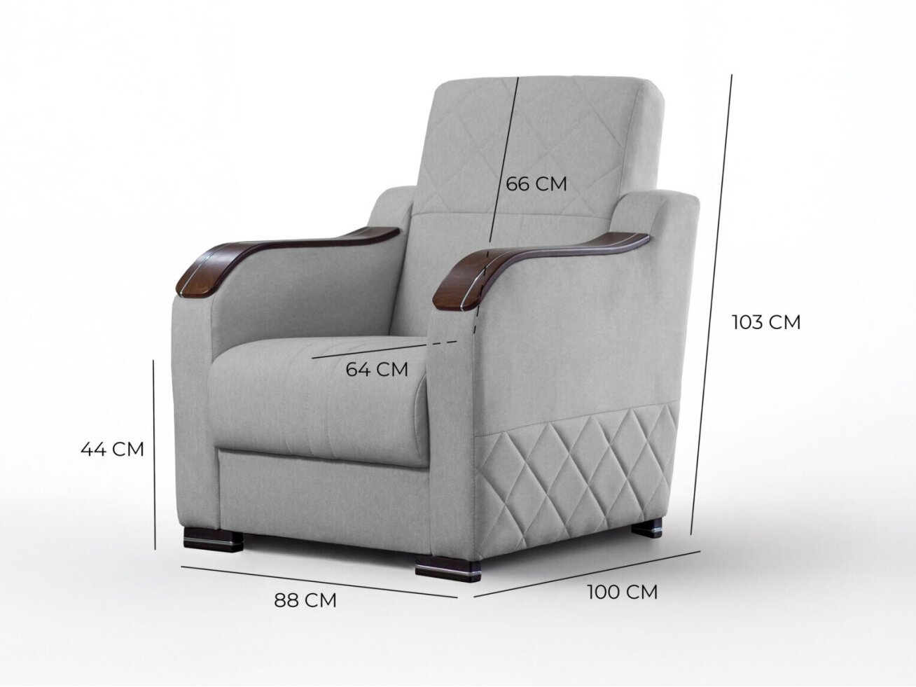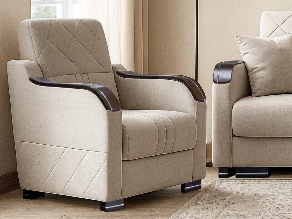 Šis fotelis išsiskiria elegantišku, klasikiniu dizainu ir aukštu sėdėjimo komfortu. Minkštas, šviesus gobelenas dera su tamsaus medžio porankiais, kurie suteikia prabangos įspūdį. Dekoratyviniai siuvinėjimai ant atlošo ir šonų papildo išvaizdą subtiliomis detalėmis. Tvirtas korpusas ir ergonomiška forma užtikrina patogų poilsį tiek svetainėje, tiek darbo kambaryje.