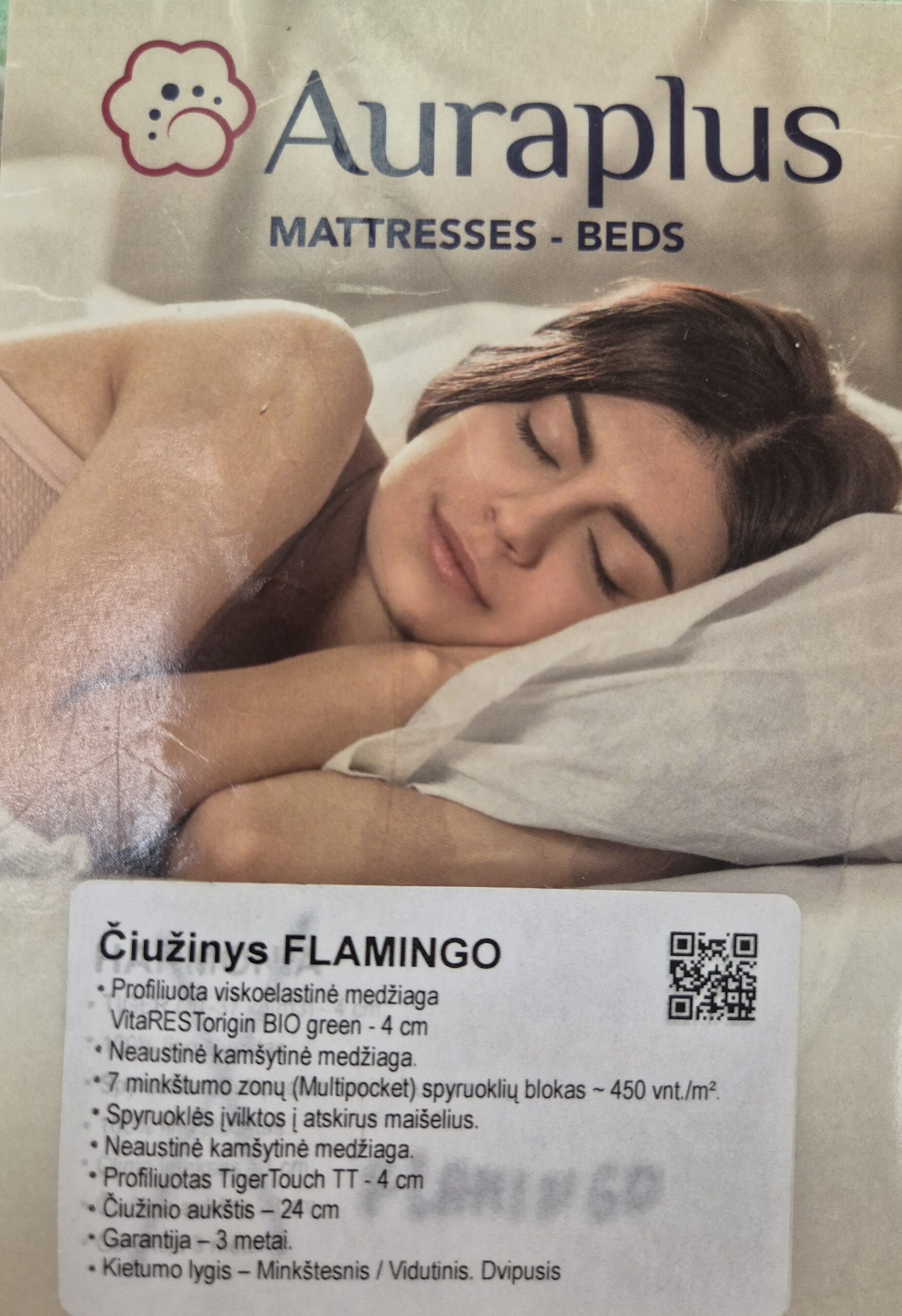 Spyruoklinis čiužinys FLAMINGO padės miegoti ramiai ir patogiai visą naktį, nejaučiant partnerio judesių, jei miegate ne vienas (pvz. čiužinys 160×200). Iš vienos pusės čiužinyje naudojamas Tiger Touch TT patvarus, atviros struktūros, profiliuotas, putų poliuretanas, pasižymintis latekso savybėmis. Tai medžiaga suteikianti čiužiniui elastingumo, užtikrina ilgalaikį komfortą ir tinkamą kūno atramą, puikų oro pralaidumą. Kitą čiužinio pusę dengia VitaRest origin BIO green – atvirų porų, profiliuota, viskoelastinė medžiaga lėtai prisitaikanti prie kūno formų, sumažina spaudimą ir užtikrina nepriekaištingą miego pagrindą. Į VitaRest origin BIO green putas įmaišytas ricinos aliejus pasižymi antibakterinėmis, priešgrybelinėmis ir priešuždegiminėmis savybėmis. Taip pagamintas čiužinys yra puikus sprendimas net ir alergiškiems bei jautrios odos žmonėms. Čiužinio gamyboje naudojamos sertifikuotos medžiagos bei klijai kurie atitinka griežtus aplinkosaugos standartus.