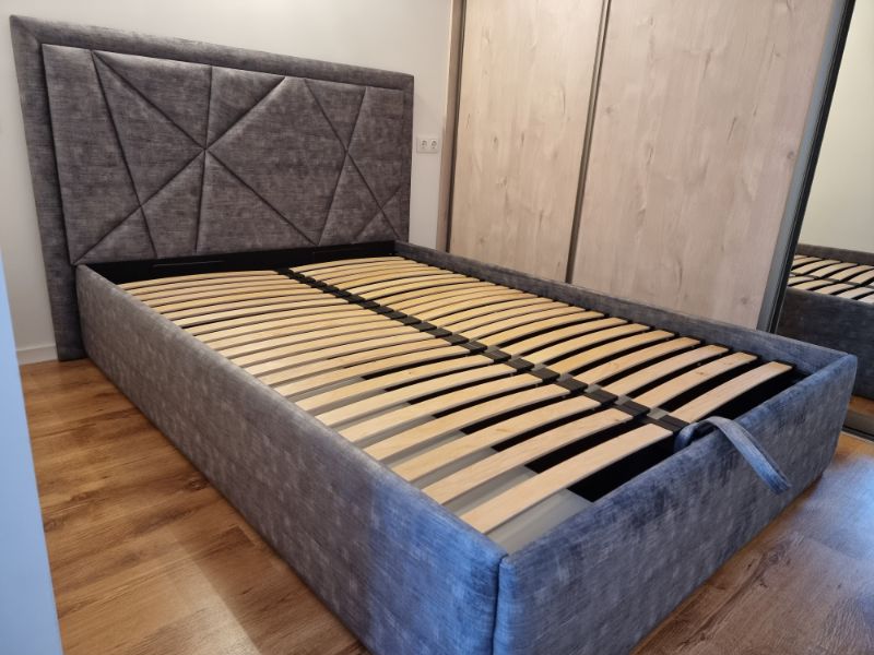 Tai modernaus dizaino, veliūru aptraukta dvigulė lova su patogiu pakeliamu grotelių mechanizmu ir erdvia patalynės dėže.