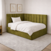 Tai modernaus dizaino, veliūru aptraukta kampinė lova su patogiu pakeliamu grotelių mechanizmu ir erdvia patalynės dėže.