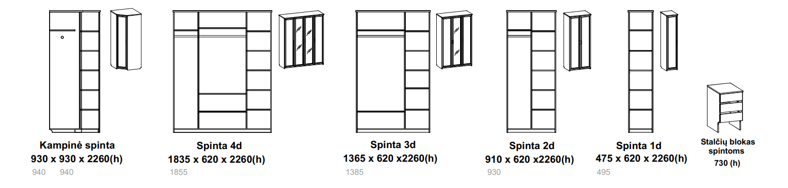 Baldas Plotis, cm Gylis, cm Aukštis, cm Sppinta kampinė 93 93 226 Spinta 4D 183 62 226 Spinta 3D 136 62 226 Spinta 2D 91 62 226 Spinta 1D 47 62 226 - Gamybos terminas 2 – 8 savaitės