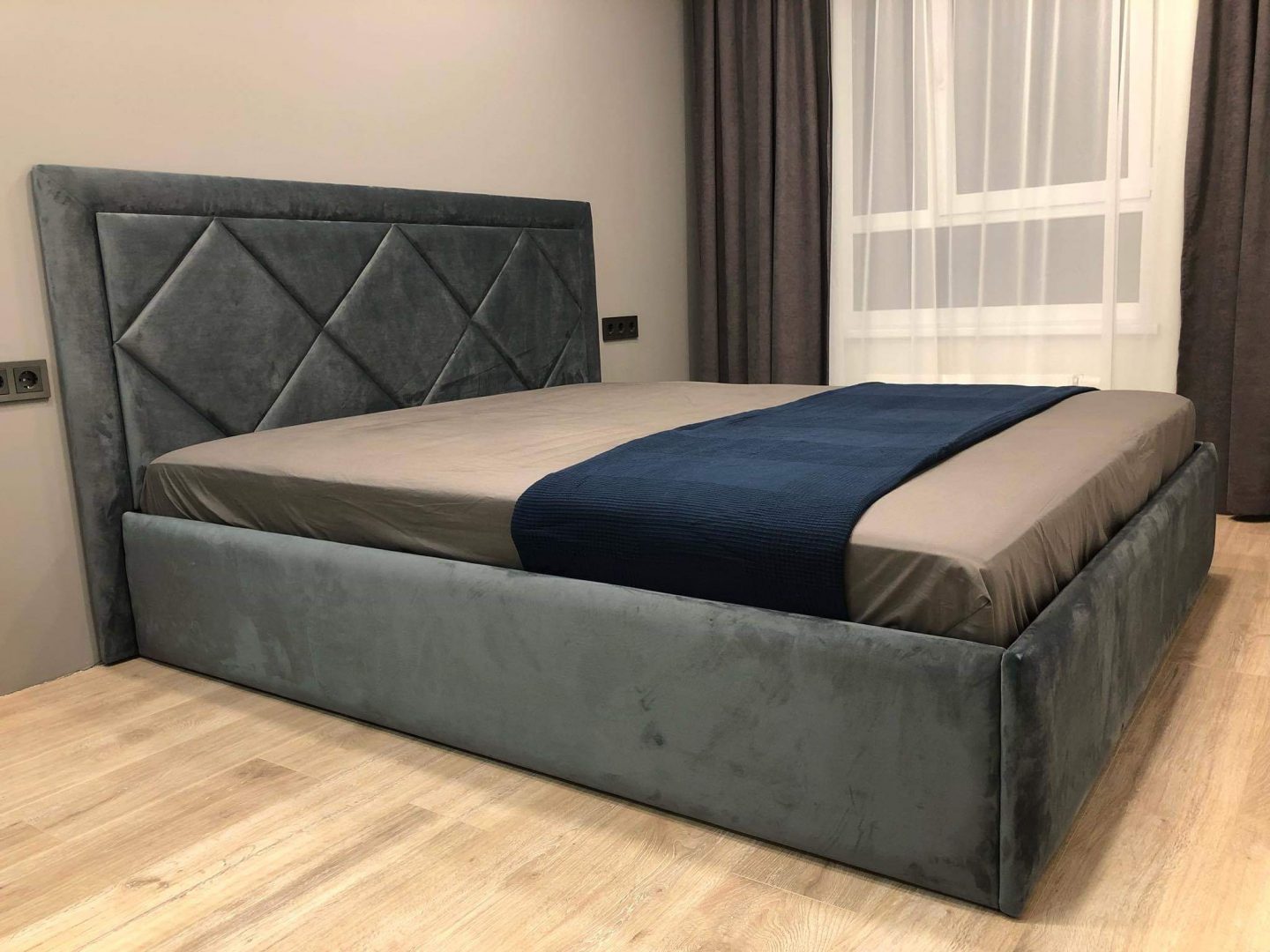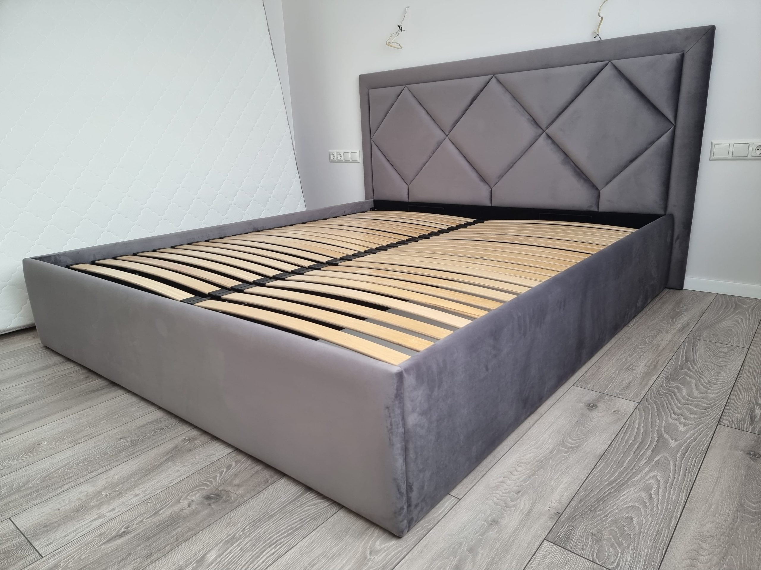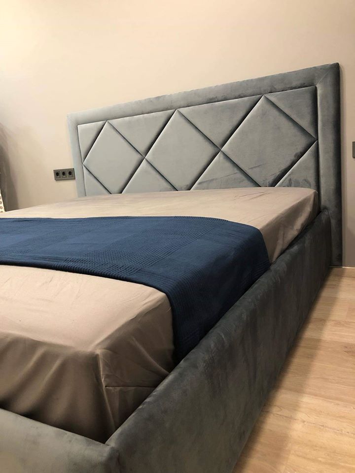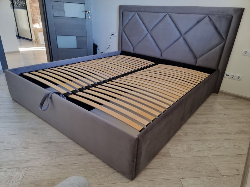 Tai modernaus dizaino, veliūru aptraukta dvigulė lova su patogiu pakeliamu grotelių mechanizmu ir erdvia patalynės dėže.