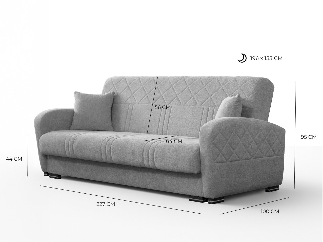 • Sofos išmatavimai (plotis/aukštis/gylis): 227 cm / 95 cm / 100 cm