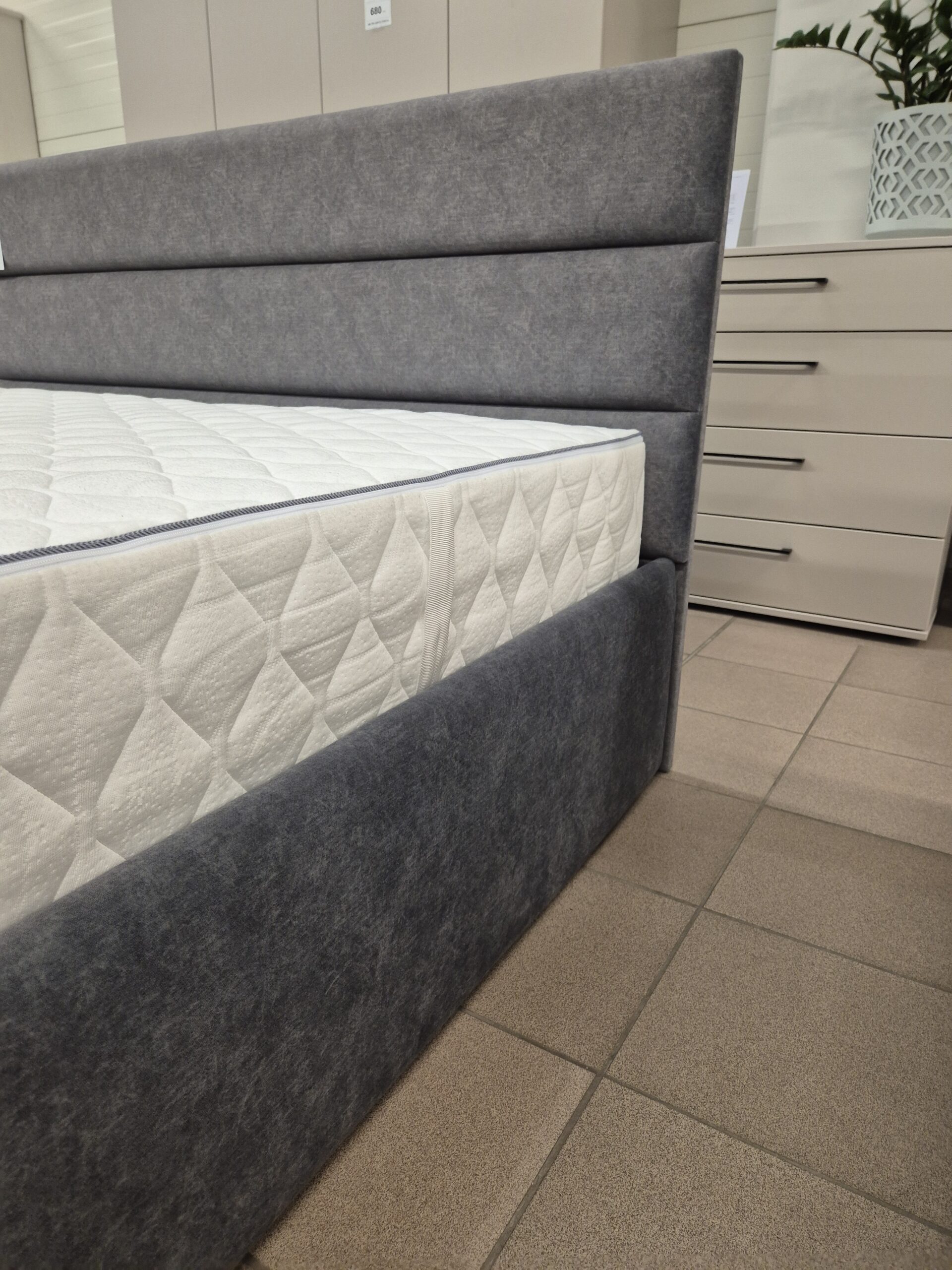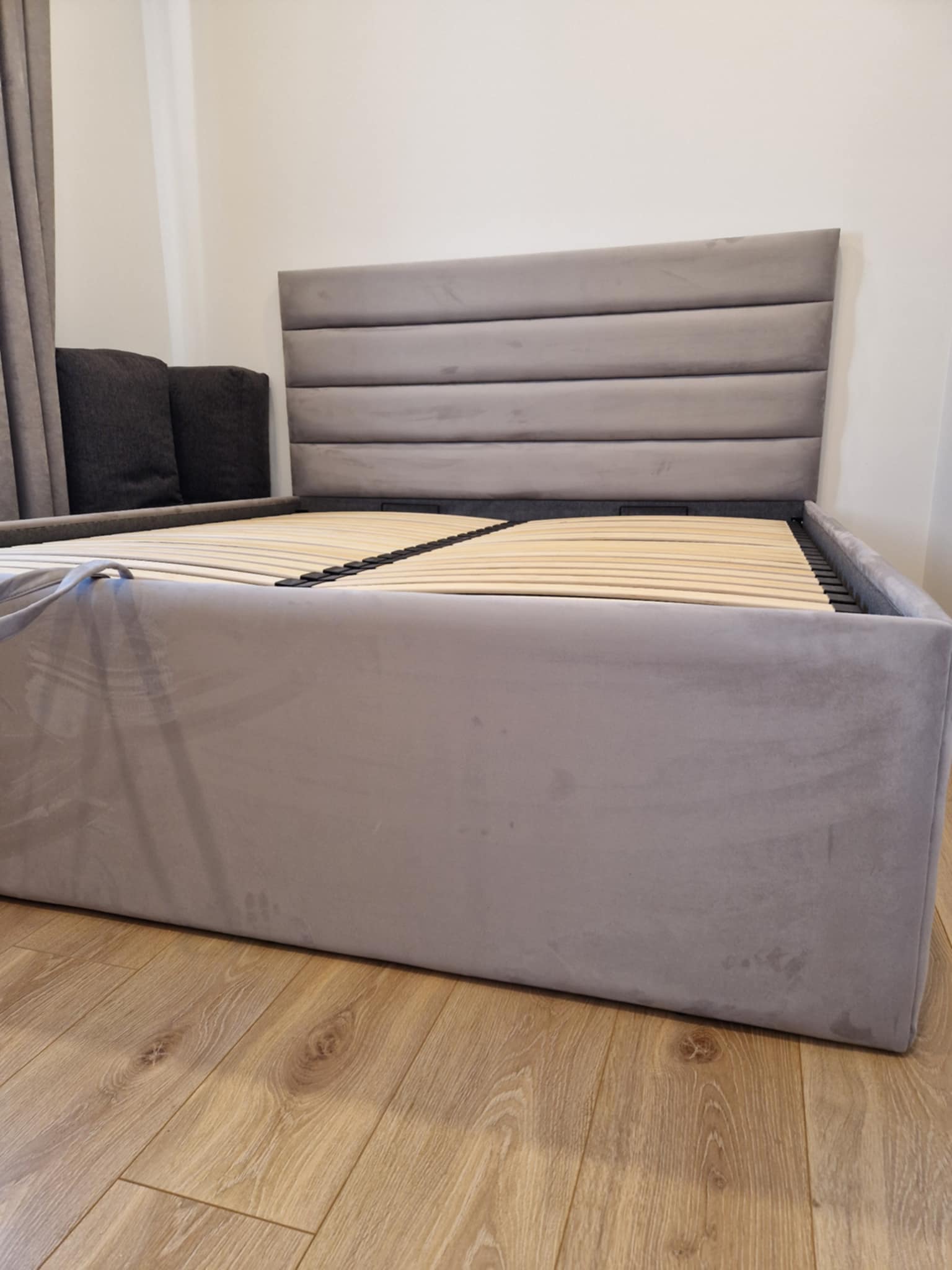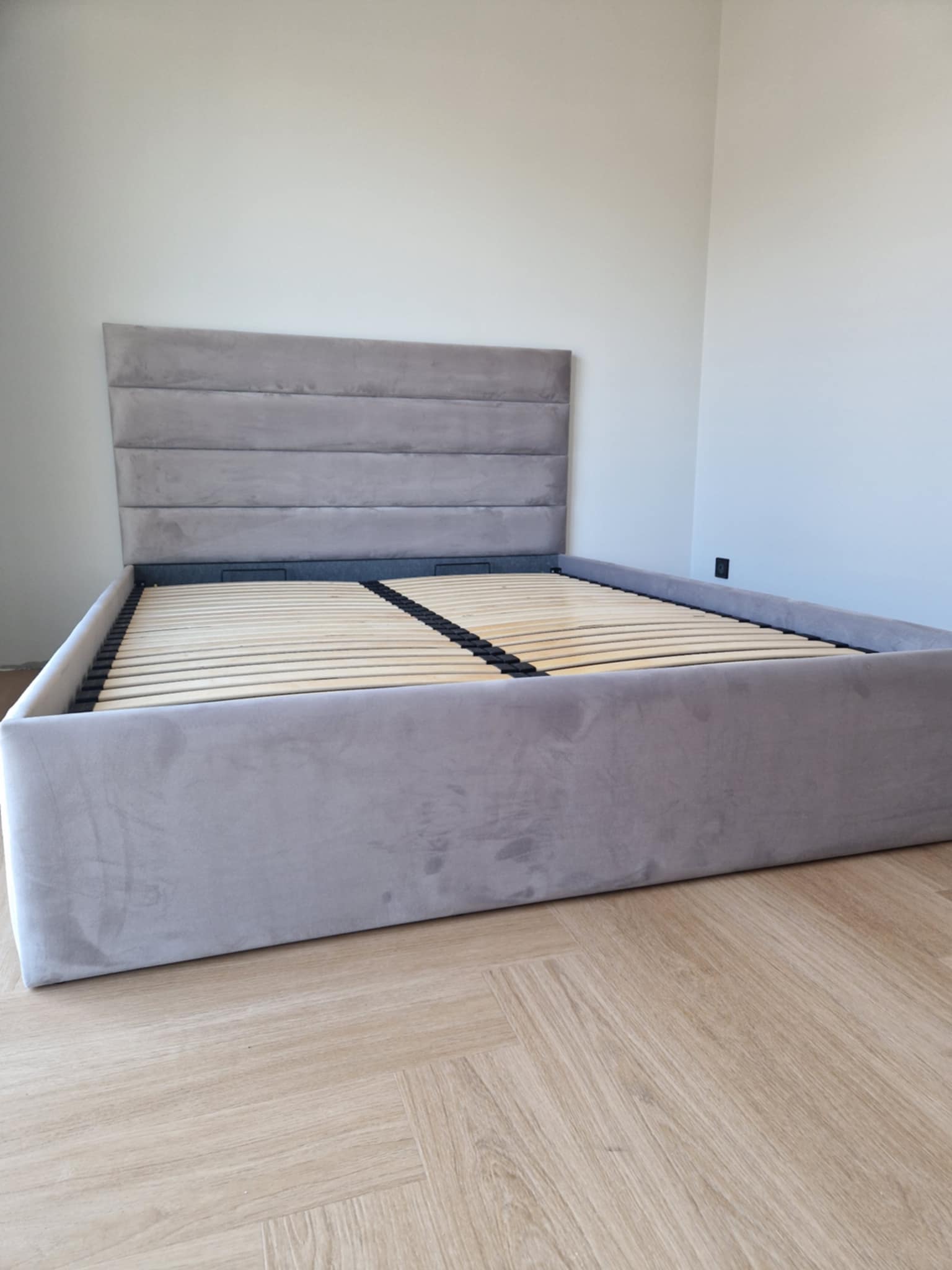 Tai modernaus dizaino, veliūru aptraukta dvigulė lova su patogiu pakeliamu grotelių mechanizmu ir erdvia patalynės dėže.