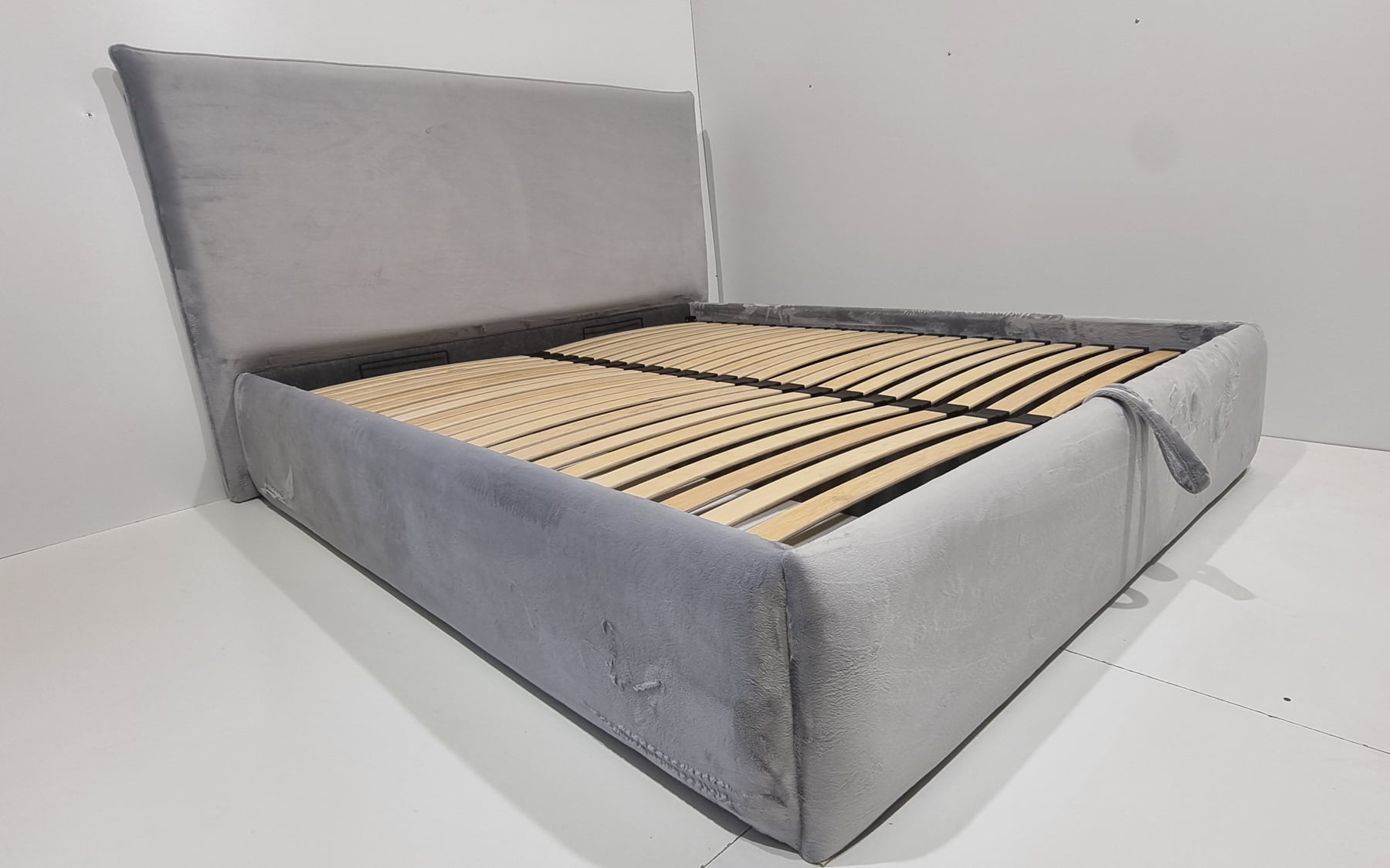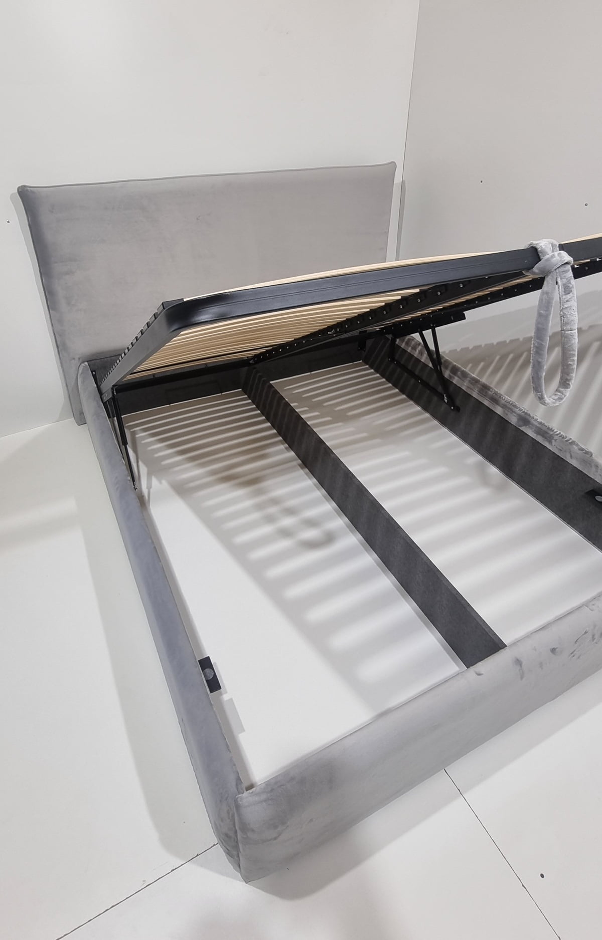 Tai modernaus dizaino, veliūru aptraukta dvigulė lova su patogiu pakeliamu grotelių mechanizmu ir erdvia patalynės dėže.